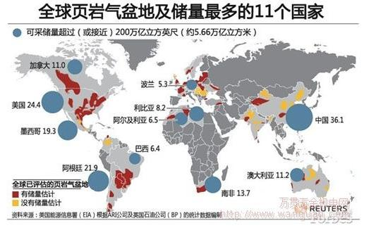 頁巖的滲透率很低,在以往都不具有商業(yè)開采價值,直到儲層壓裂技術(將地下儲層壓出裂縫,改善滲透率)的迅速發(fā)展,頁巖氣開發(fā)逐漸變得普遍。全球頁巖氣儲量有450萬億立方米,其中35%在美洲,35%在亞太地區(qū),其余15%在中東地區(qū)。我國頁巖氣資源潛力大,初步估計我國頁巖氣可采資源量在36.1萬億立方米,與常規(guī)天然氣相當,居世界第一位。